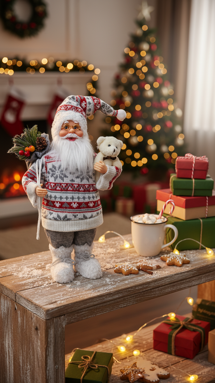 Imagine ce doux Père Noël, avec son pull tricoté et son ours. Posé sur ta cheminée ou ta table, il apportera une chaleur réconfortante et l'esprit de Noël à ton foyer, contant des histoires.